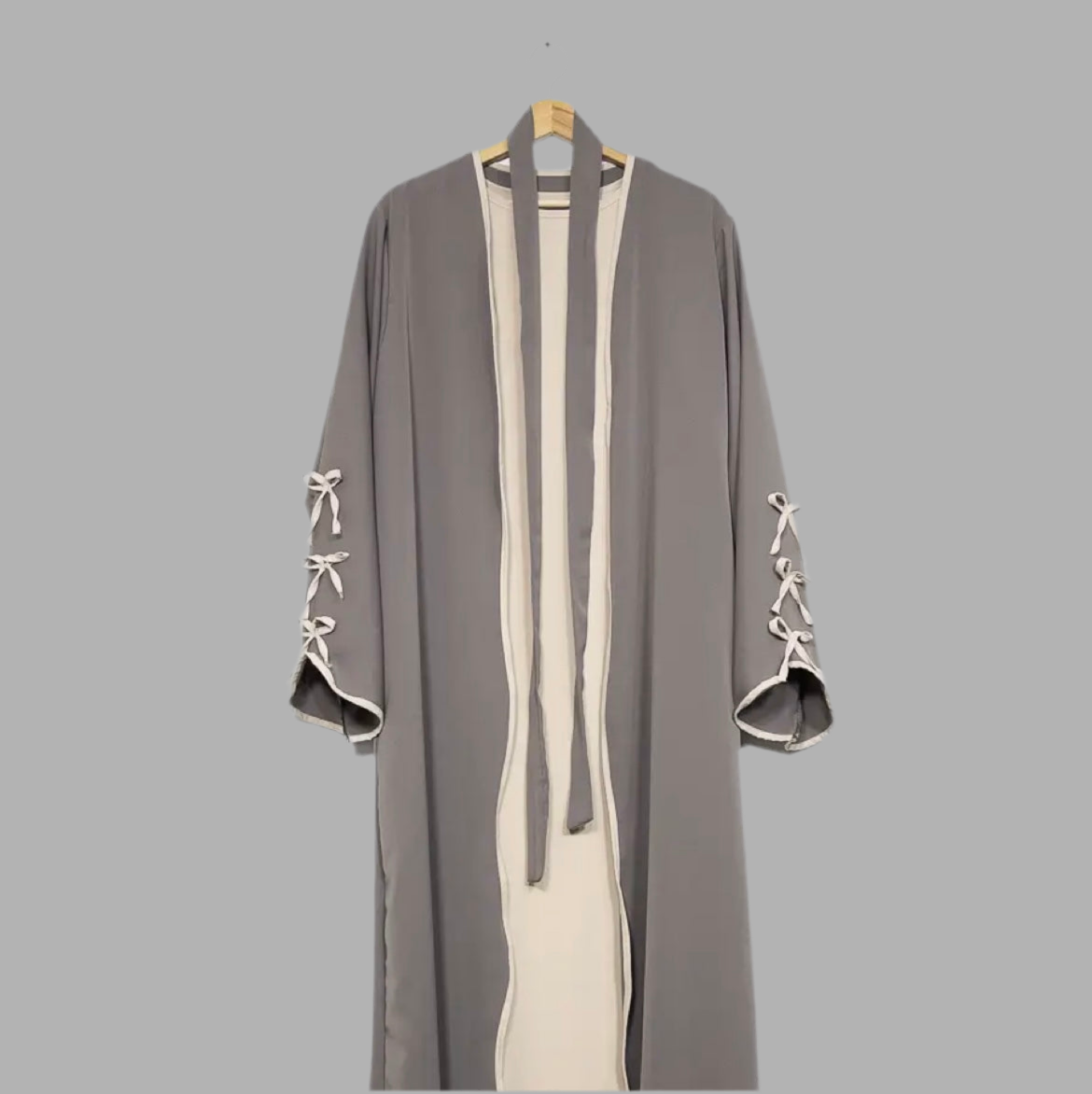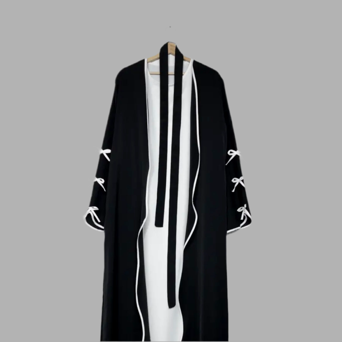 Erlebe zeitlose Eleganz mit unserer dreiteiligen Abaya, die Stil und Komfort harmonisch vereint. Diese edle Abaya besteht aus einem fließenden Unterkleid, einem fein geschnittenen Kimono sowie einer passenden Schleife, mit der sich die Abaya individuell binden lässt.